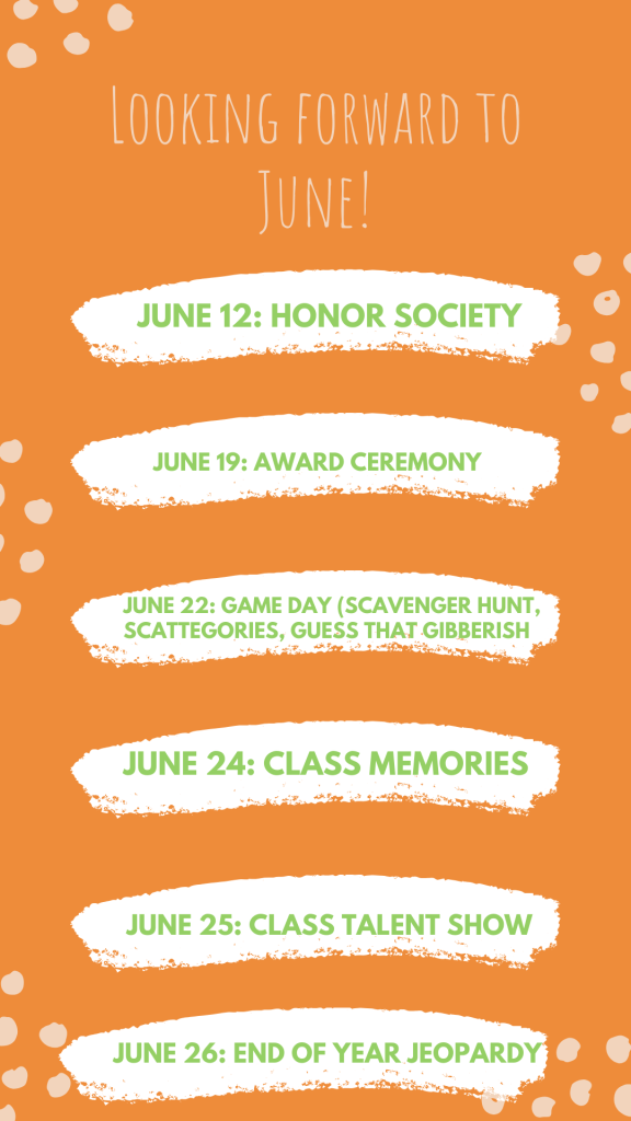 This year has been a new experience for us all. However, our students still deserve the same exciting activities and celebrations that they would receive in the school building. As the last day of school is June 26, I kicked off the month of June with the announcement of our up and coming exciting activities.